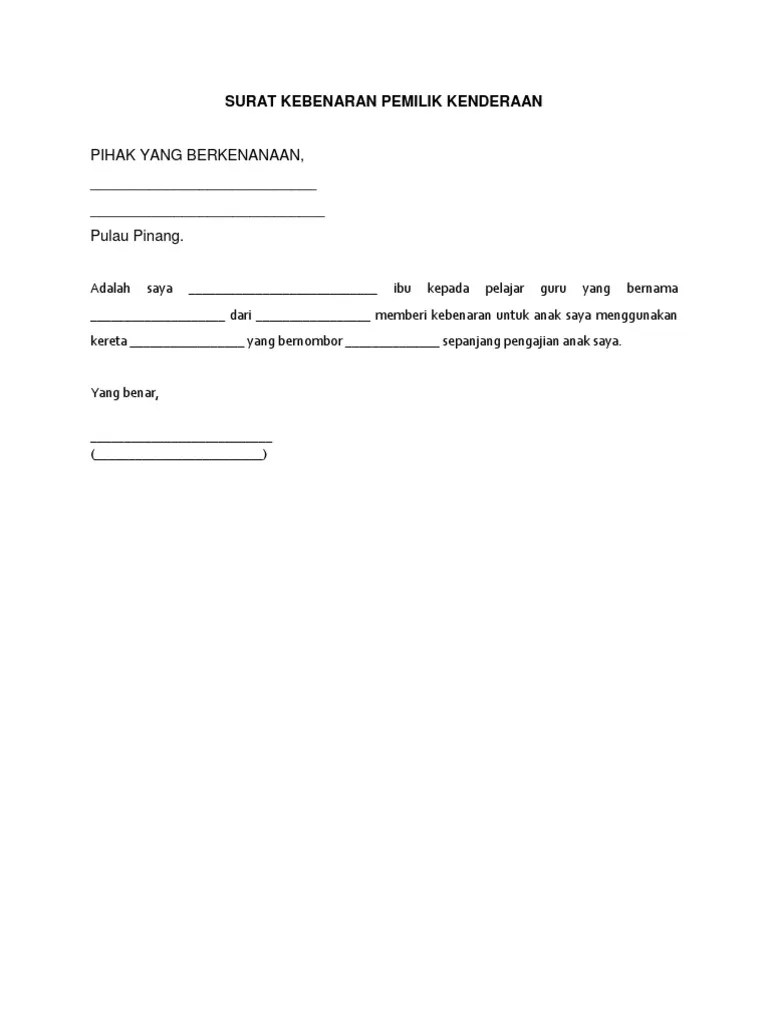 Surat Memberi Kebenaran Menggunakan Kenderaan / Contoh Surat Wakil Portal Malaysia. This document was uploaded by user and they . Untuk makluman pihak tuan, nombor pendaftaran kenderaan tersebut.